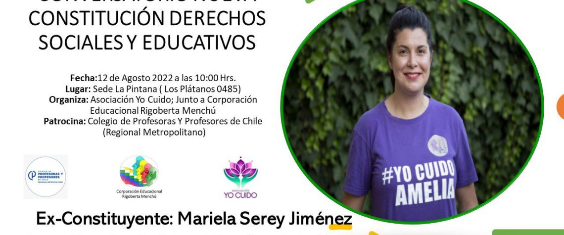Ex-Constituyente: Mariela Serey Jiménez Tema : Derechos Sociales y Educativos de la Nueva Constitución de Materia de Discapacidad y Cuidador@as Fecha: 12 de Agosto 2022 a las 10:00 AM Organiza: Asocición Yo Cuido; Junto a Corporación Educacional Rigoberta Mench{ú Patrocina: …